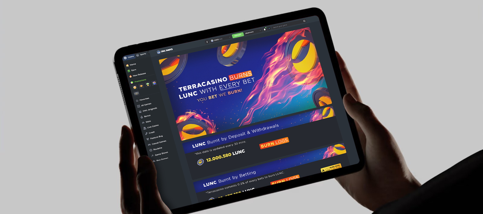 This website mockup represents a high-end design concept for TerraCasino, a platform built to integrate gambling with token utility. The UI features a sleek, dark aesthetic that highlights the intensity of the games while maintaining a professional and secure feel. A core feature of this design is the integrated burn mechanism, where a portion of the Terra tokens used in every bet is permanently removed from circulation.